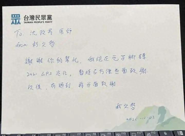 柯文哲在信中写下:“TO沈政男医师,谢谢你的帮忙,我现在电子脚镣,24hr GPS定位,暂时不方便当面致谢,以后有遇到再当面致谢。”
