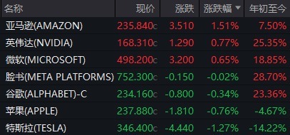 科技股方面,大型科技股表现分化。亚马逊涨超1%,英伟达、微软小幅上涨,而META、谷歌-C、苹果则小幅下跌,特斯拉跌幅超过1%。芯片股多数上涨,博通涨超3%,阿斯麦、台积电、西部数据等均有不错表现。