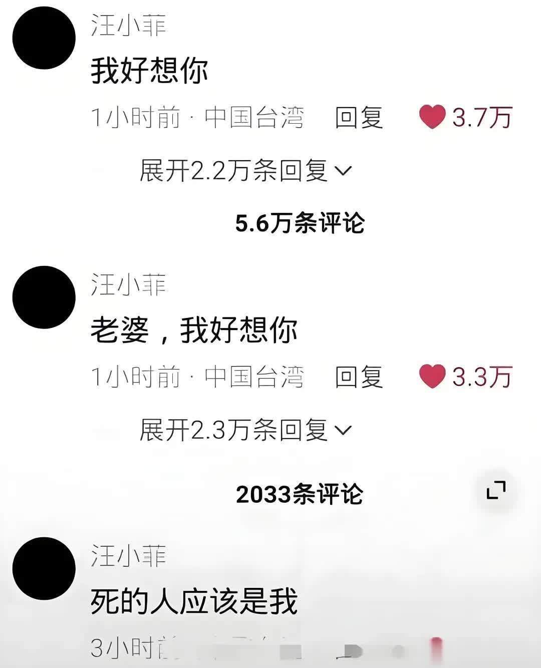 2月4日,汪小菲在曾经和大S录制《幸福三重奏》的某条视频底下评论:“我好想你!老婆我好想你!死的人应该是我”。