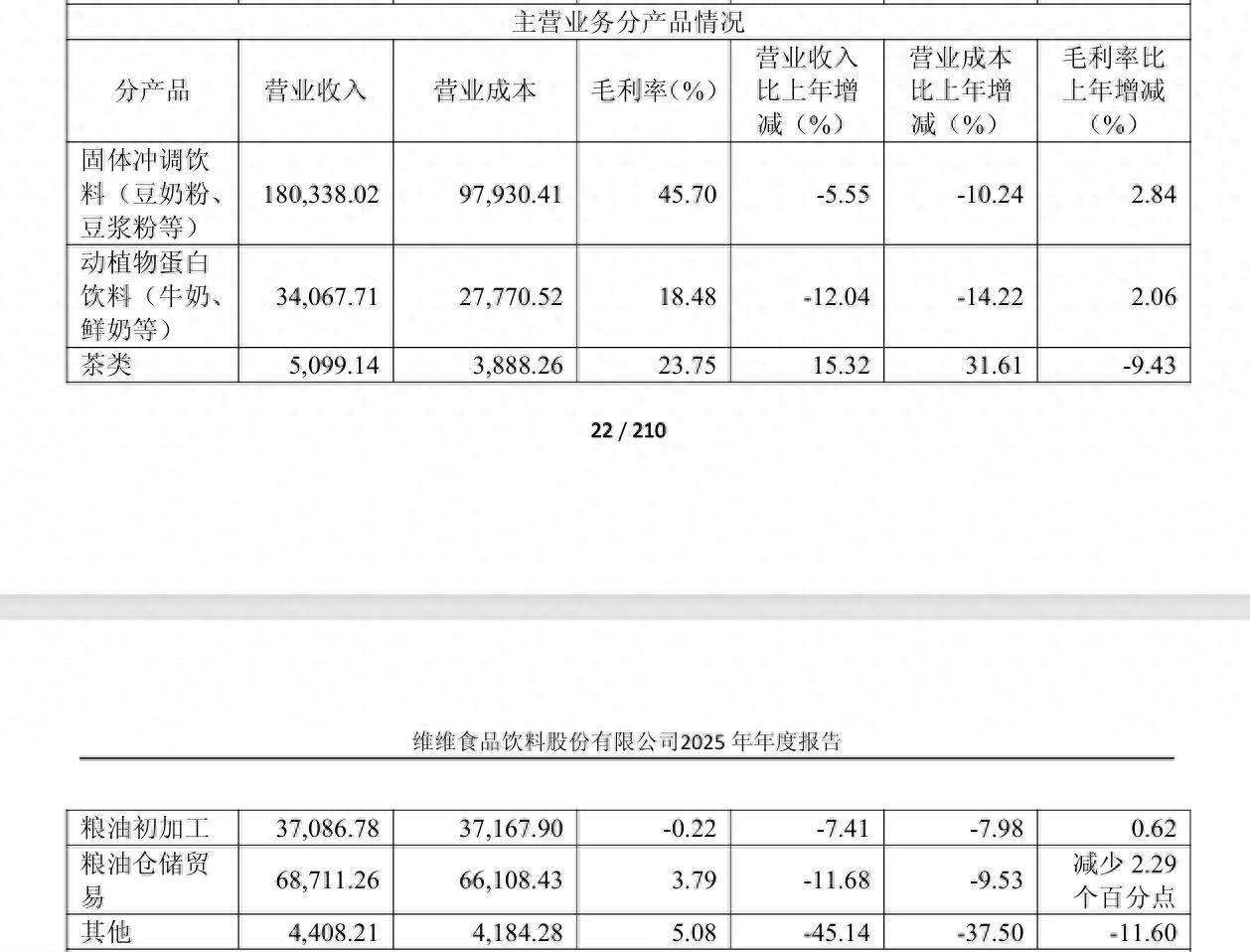 分产品来看,2025年,维维股份固体冲调饮料(豆奶粉、豆浆粉等)、动植物蛋白饮料(牛奶、鲜奶等)营收同比分别减少5.55%、12.04%;粮油初加工、粮油仓储贸易营收同比分别减少7.41%、11.68%;茶类产品营收同比增长15.32%至5099.14万元。