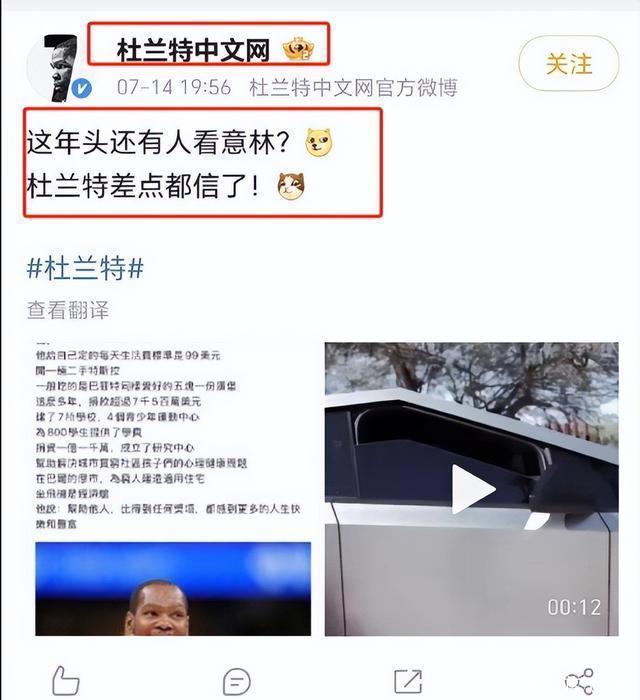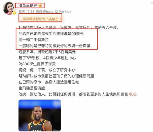 她在文中表示, 杜兰特生活非常节俭,开二手车,吃便宜的食物。 但是,被她夸奖的杜兰特并不买账。 很快杜兰特中文网便公开戳破她所说的不实言论, 而这篇文章也被官方标记为不实信息。