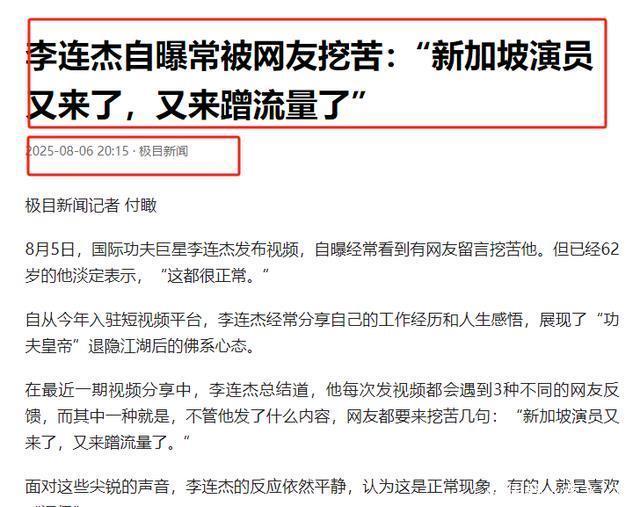 虽然, 他本人坚定地表示自己始终是炎黄子孙 ,但却因为新加坡国籍被指言行不一。 在近日发布的视频中, 李连杰自曝经常有网友在他的社交账号下评论“新加坡演员、又来蹭热度”之类的话语。